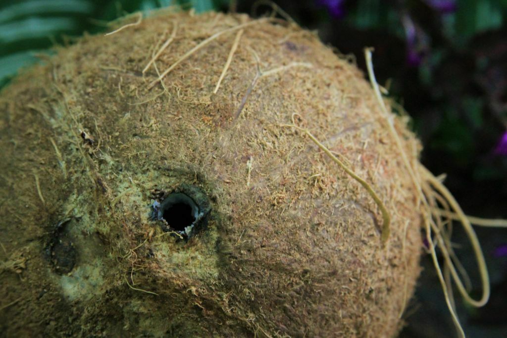O primeiro passo é abrir o coco seco, pode parecer um pouco assustador porque a casca é bem dura, mas na verdade a técnica é bem simples. O coco tem três cavidades que lembram uma bola de boliche, sempre uma dessas três cavidades é bem molinha e fácil de ser perfurada com uma faca de ponta.