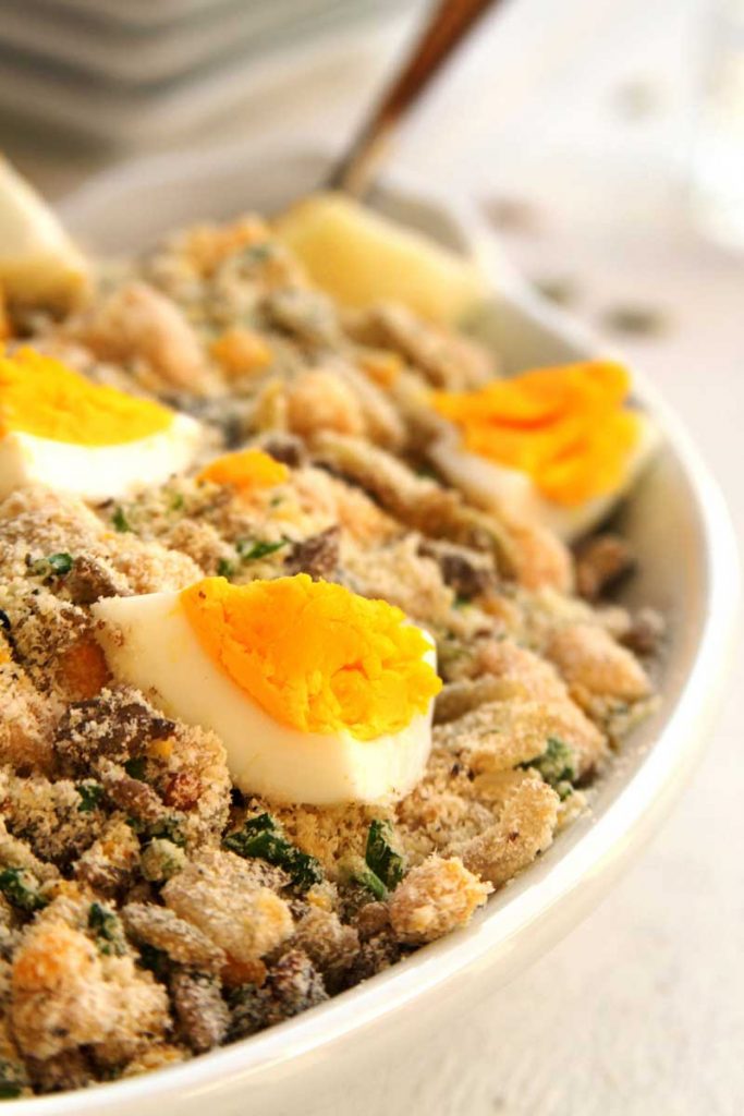 - Se preferir que os ovos fiquem mais aparentes na travessa misture 3 ovos picados na farofa e reserve 1 ovo para decoração, colocando apenas no final.