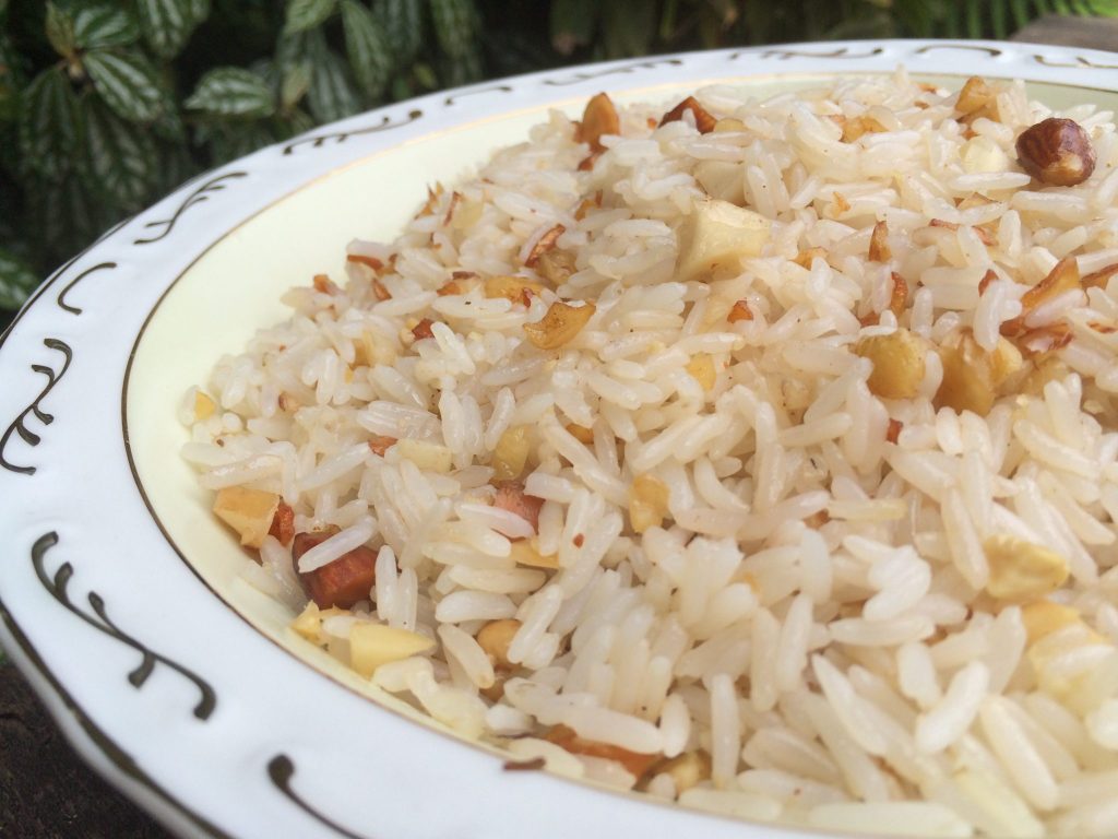 O arroz é um prato simples e que todo mundo adora, existe até aquela expressão “arroz de festa” e esta receita definitivamente faz jus a este jargão. E pra deixar este prato tradicional mais sofisticado eu adicionei um mix de castanhas super delicioso, muita manteiga e alho dourado. Tenho certeza que todos seus convidados vão adorar esta combinação! INGREDIENTES: 4 x de arroz parboilizado 2 c de sopa de óleo ou azeite de oliva 2 dentes de alho Sal a gosto 1-1,5 litros de água quente MODO DE PREPARO: Esquente uma panela grande e adicione o óleo e o alho picado. Quando o alho começar a mudar de cor adicione o arroz já lavado e escorrido. Deixe fritar mexendo de vez em quando para que o alho que estiver em contato com o fundo da panela não queime. Quando o arroz começar a ficar douradinho adicione a água quente cobrindo mais ou menos 1…